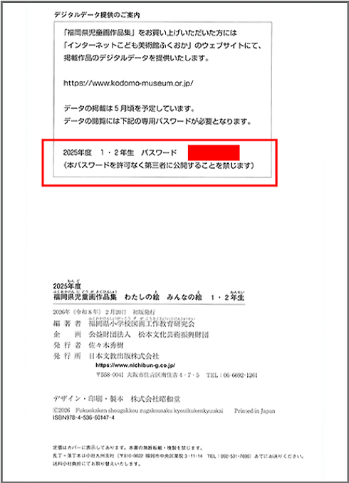 お知らせ お知らせ 2026.04.06 令和7年度(2025年度)第72回 福岡県児童画作品集 デジタルデータ(有償)を掲載しました。 デジタルデータ有償版ダウンロード令和7年度(2025年度)第72回 福岡県児童画作品集 デジタルデータ(有償)を掲載しました。画集を購入された方のみ閲覧ができます。 <1年生版> <2年生版> <3年生版> <4年生版> <5年生版> <6年生版> 閲覧方法ダウンロード後、ご購入いただきました福岡県児童画作品集巻末に記載のパスワードで解凍することで閲覧ができます。 <!ご注意!>1・2年生版、3・4年生版、5・6年生版で各々パスワードが異なりますので、ダウンロードファイルとパスワード入力のお間違いが無いようご注意ください。 2026年 (1) 2025年 (2) 2024年 (1) 2023年 (3) 2019年 (1) 2017年 (2) 2016年 (1) 2015年 (1) 2014年 (1)